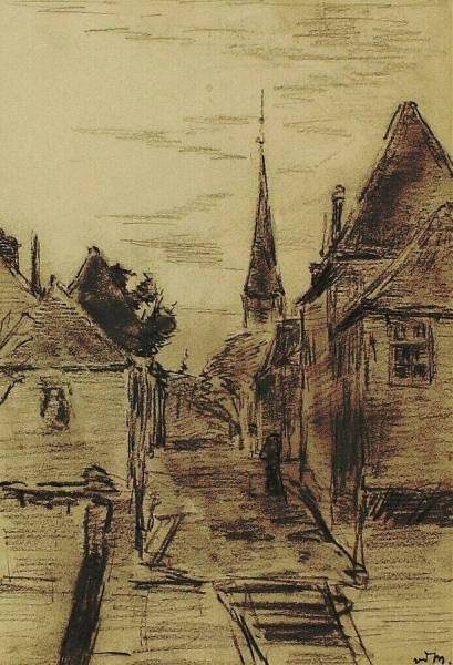 Dorpsstraatje met kerktorentje, late 19th - early 20th century