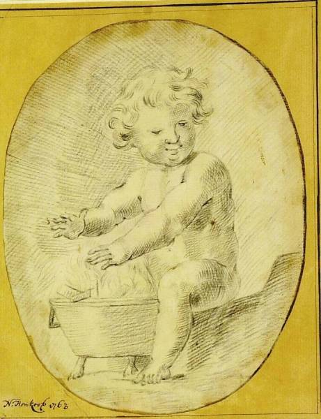 Naakte putto zich warmend bij een vuurbak, in een ovaal medaillon, 1763
