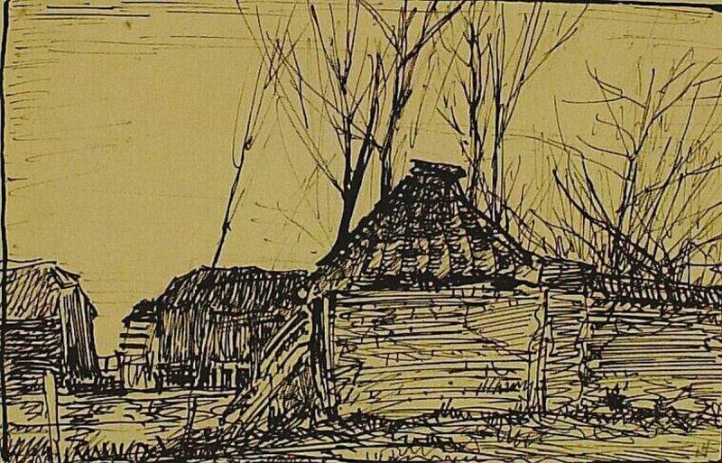 Muurtje met boerenwoning en kaal geboomte, c. 1918