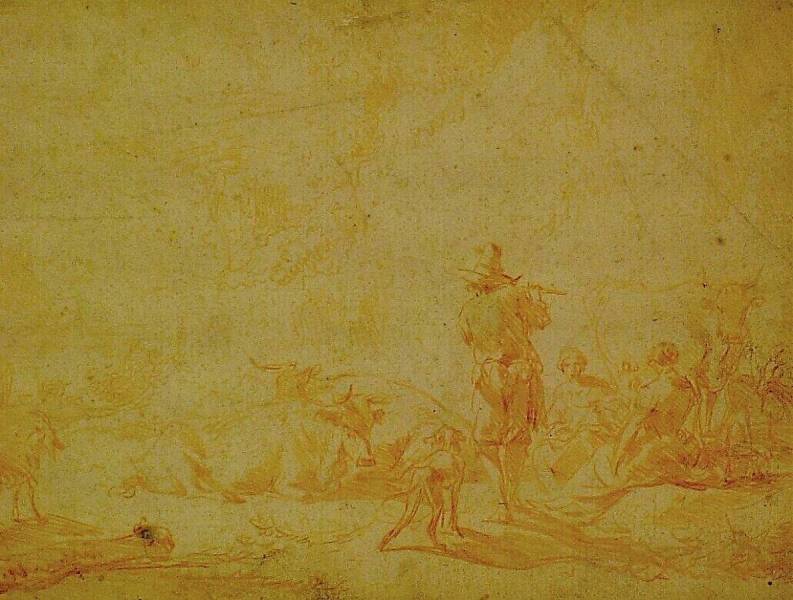 Landscape with Flute-Playing Shepherd near Sitting Figures and Cattle