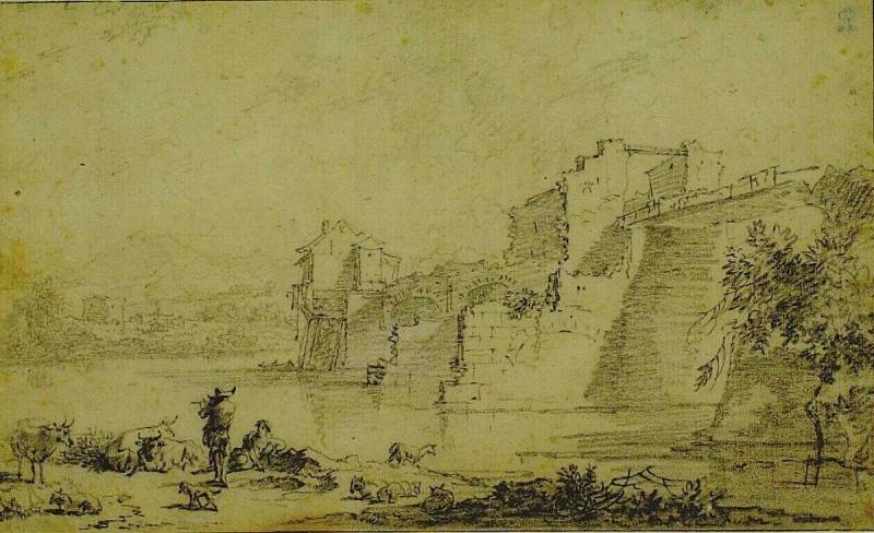Herders met vee bij een ruïneuze brug over een rivier, mid 17th century