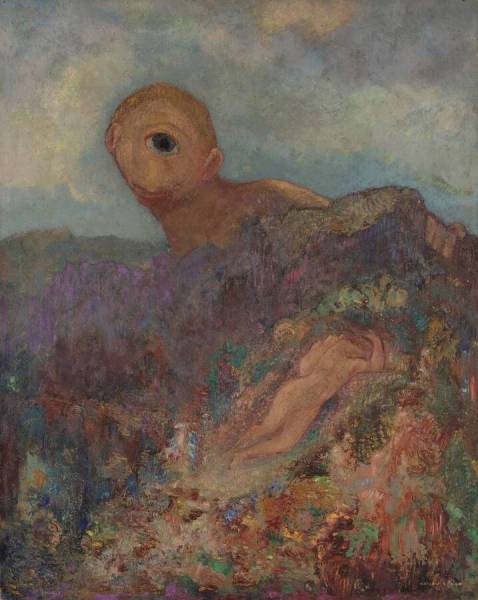 The menace of the giant, or rather of the eye, that spies the naked woman, is reinforced by the unusual bright colours. With this personal, dreamlike depiction of a theme from the realm of the Greek gods, Redon has painted one of the masterpieces of symbolist art.