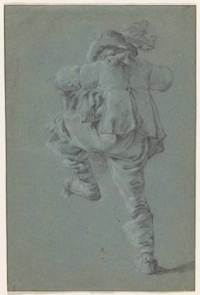 black and white chalk on blue paper; framing lines in pen and black ink
