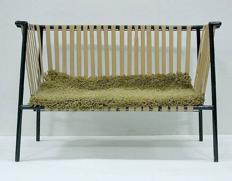 seat and back of braided rubber band, black painted metal frame, covered with a knotted rug