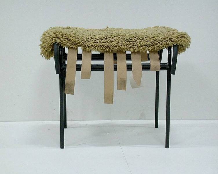 seat of braided rubber strap, black painted metal frame, covered with a knotted rug