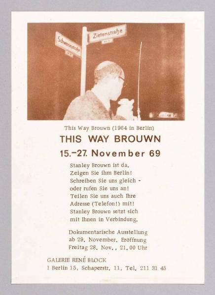 uitnodiging 'this way brouwn 15. - 27. November 69 Galerie Rene Block Berlin', 1969