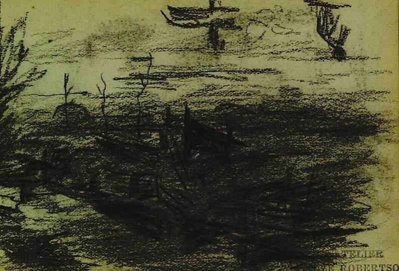 Landschap met platte schuiten en een kruiende man, late 19th - early 20th century