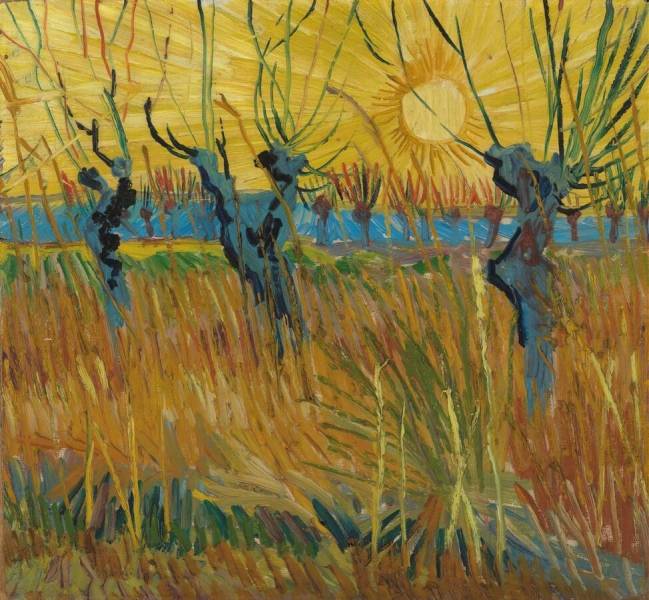 Van Gogh paints Pollard willows at sunset in March, just as the new leaves are sprouting on the trees. He uses bright yellow, orange, red and blue colours and applies them with a confident touch of alternately longer and shorter erratic brushstrokes. The clear blue stripe behind the pollard willows probably represents the distant Alpilles mountain range.