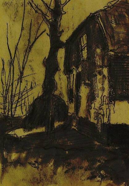 Gevel van een oud huis met een kale boom er voor, late 19th - early 20th century