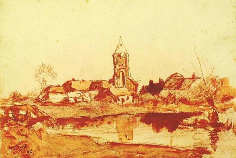 Gezicht op een dorpje met oude kerktoren, 1904
