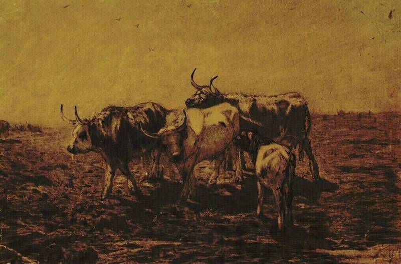 Groep van drie gaande ossen en een kalf in een wei, 1864