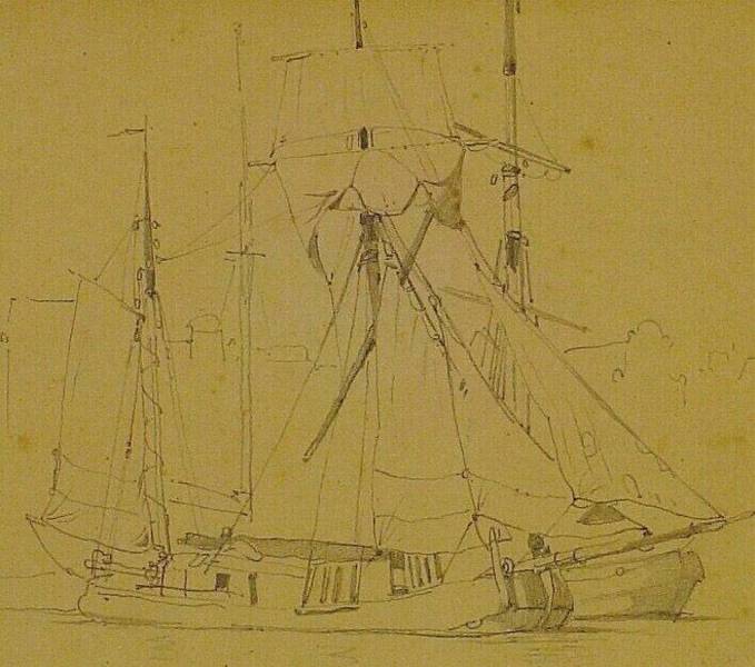 Schepen met grachtenhuizen op de achtergrond, c. 1860