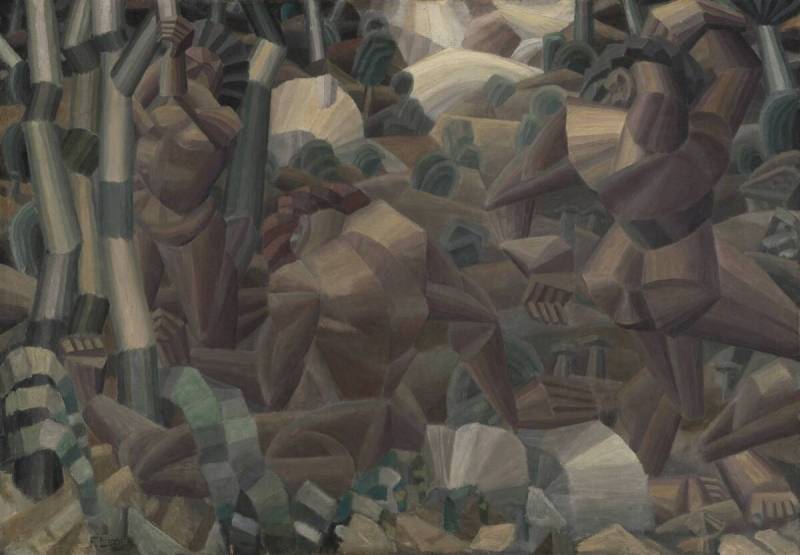 Naaktfiguren in een bos, Légers eerste grote doek, zou een eerbetoon kunnen zijn aan Cézannes analytische benadering. In een gemechaniseerd landschap staan drie naakten in geometrische vormen: een staande figuur met opgeheven armen aan de linkerkant, een zittend naakt iets meer naar onderen en een staand met een opgeheven arm helemaal rechts. De ogenschijnlijke wirwar van vormen zorgt voor veel dynamiek.