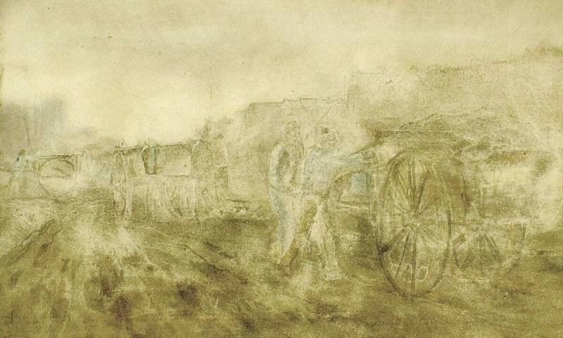 Karrenvoerders met wagens bij een stad, eind 19de - begin 20ste eeuw
