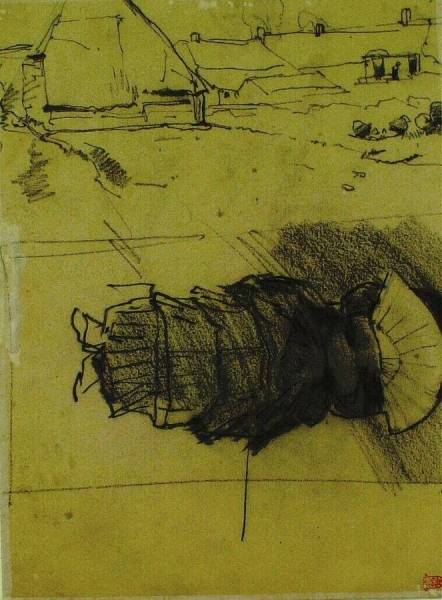 Zittende vrouw met waaier en boerderij, eind 19de - begin 20ste eeuw