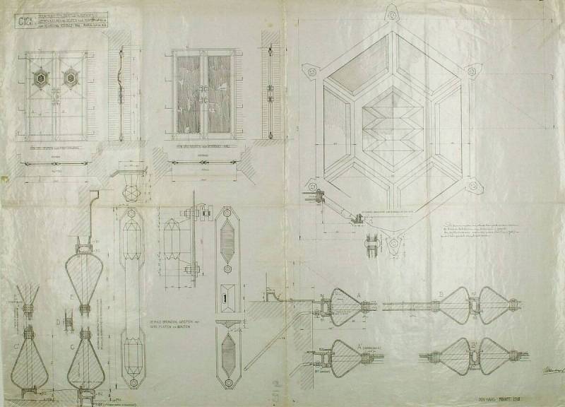 IJzeren kozijnen met deuren voor hoofdingang en voor afscheiding vestibule-hall, maart 1918