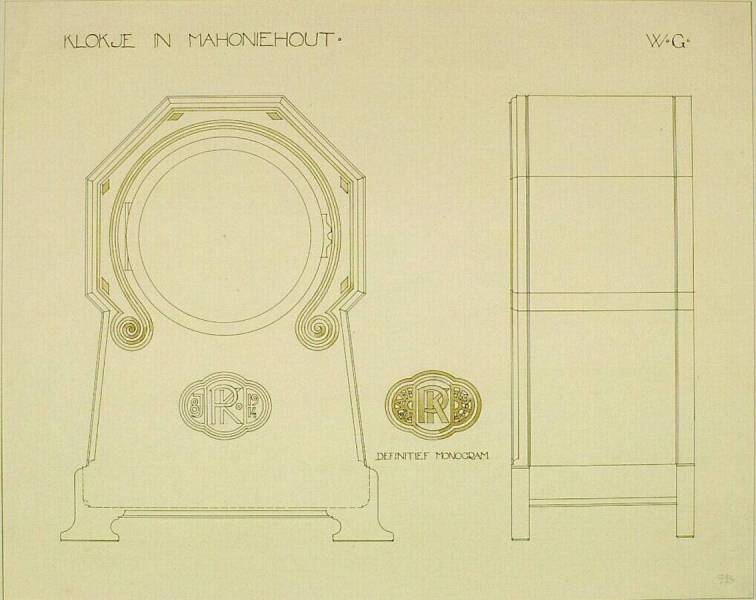 Klokje in mahoniehout: voor- en zijaanzicht, monogram PK, 1913-1914