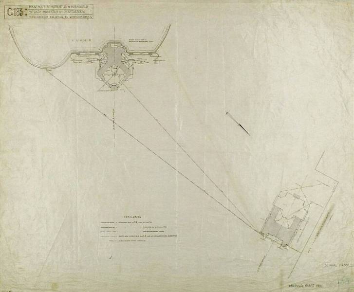 Situatie Hubertus met dienstgebouw; tevens overzicht rioleering en watervoorziening, maart 1918