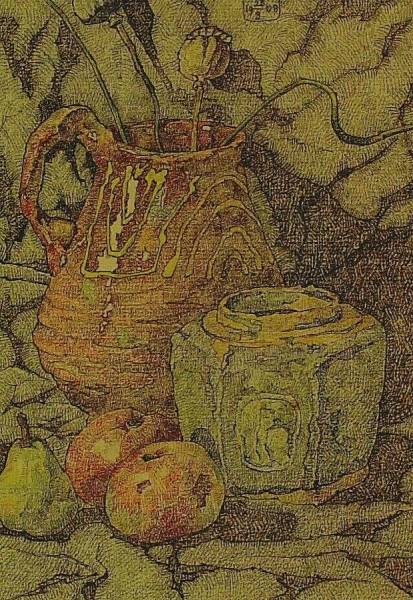 Stilleven van gemberpot, kan met twee uitgebloeide papavers, twee appels en een peer, 23 augustus 1908