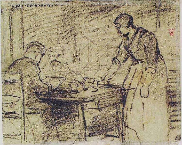Boerin en twee mannen bij een tafel, 19de eeuw