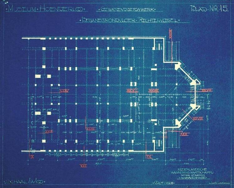 Ontwerp voor het museum bij de Franse Berg: Gewapendbetonwerk beganegrondvloer rechtervleugel, oktober 1928