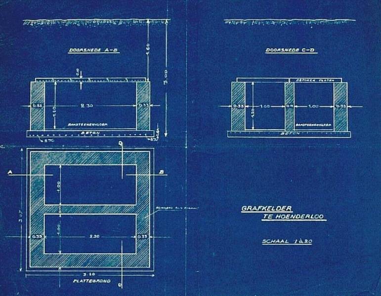 Grafkelder te Hoenderloo: plattegrond en doorsnedes A-B en C-D, ongedateerd