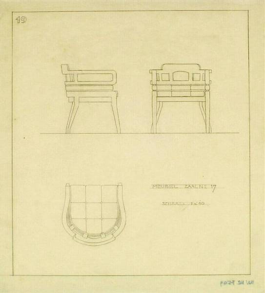 Meubilair voor het grote museum: stoel: op-, zij- en vooraanzicht, 1922-1926