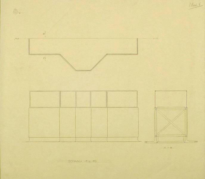 Meubilair voor het grote museum: vitrine (opzicht, aanzicht en doorsnede), 1922-1926