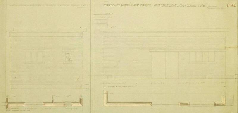 Ontwerp Rijksmuseum Kröller-Müller: Gedeelte gevel (Z.W.) gedeelte zijgevel (Z.O.), juli 1937