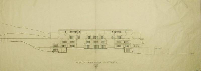 Ontwerp voor het museum bij de Franse Berg: Aanzicht westgevel (zonder schoorstenen), circa 1921-1928