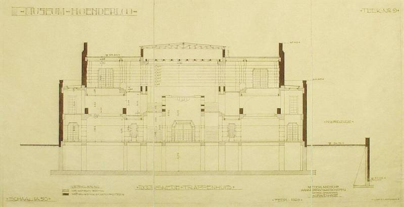Ontwerp voor het museum bij de Franse Berg: Doorsnede trappenhuis, februari 1928