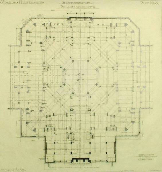 Ontwerp voor het museum bij de Franse Berg: Gewapendbetonwerk beganegrondvloer, september 1928