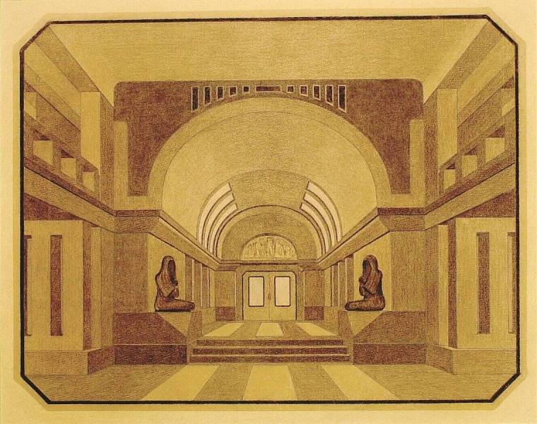 Ontwerp voor het museum bij de Franse Berg: Perspectief: gang met treden en aan het eind een dubbele deur (volgens Sembach 7680: 'Seitenhalle'), circa 1921-1928