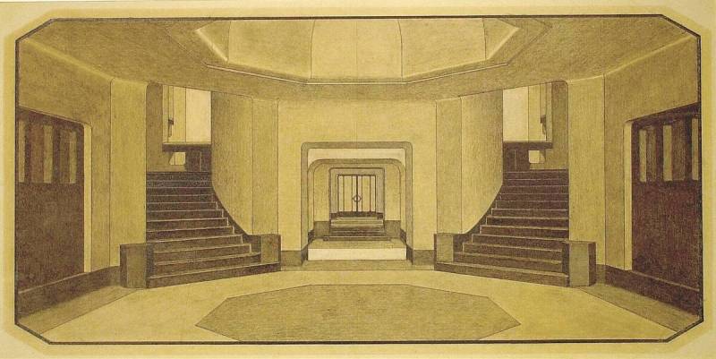 Ontwerp voor het museum bij de Franse Berg: Perspectief: hal met twee opgaande trappen en doorzicht naar een deur, circa 1921-1928