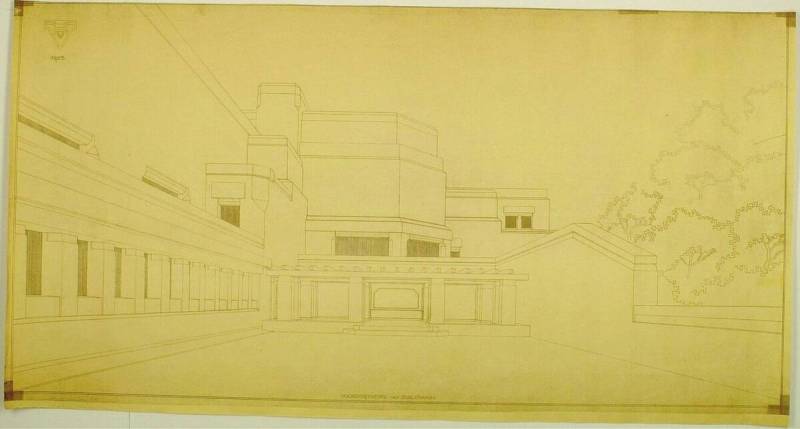 Ontwerp voor het museum bij de Franse Berg: Perspectief: noordoostgevel met zuilegang, 1923
