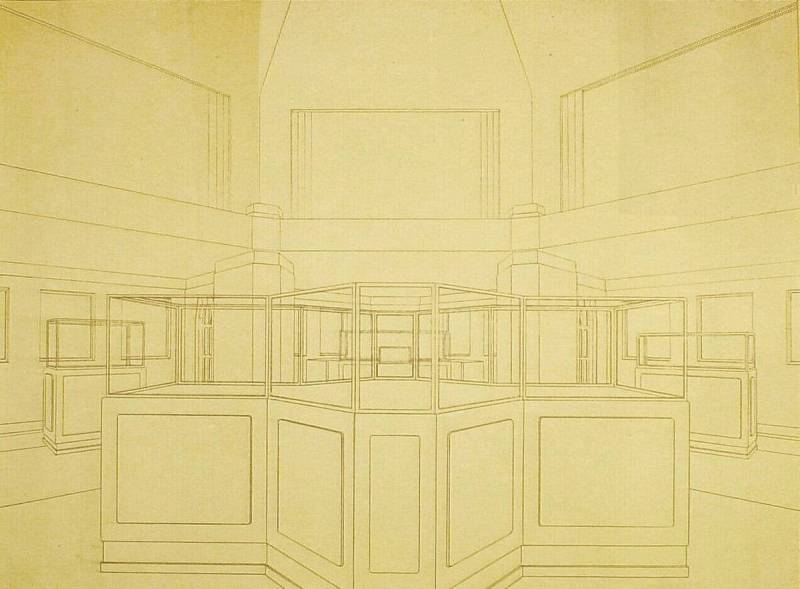 Ontwerp voor het museum bij de Franse Berg: Perspectief van zaal 8 met vitrines, circa 1921-1928