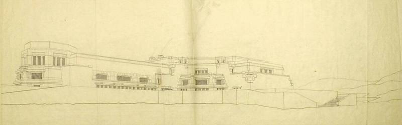 Ontwerp voor het museum bij de Franse Berg: Perspectief: vanuit het zuidwesten, circa 1921-1928