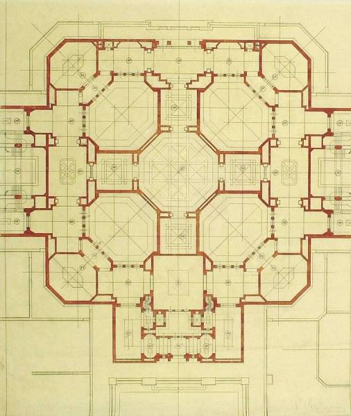 Ontwerp voor het museum bij de Franse Berg: Plan van de 1ste verdieping (middendeel), circa 1921-1928