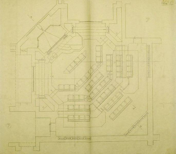 Ontwerp voor het museum bij de Franse Berg: Plattegrond met aanduiding van doorsnedes A-B en C-D en aan- en opzichten A, B, C, D, E en F, circa 1921-1928