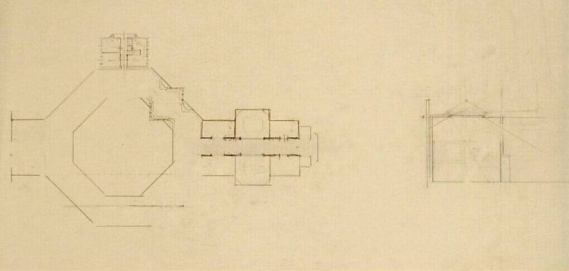 Ontwerp voor het museum bij de Franse Berg: Schets voor plattegrond en doorsnede voor verlichting, na 1925