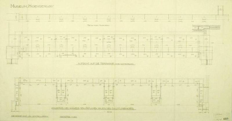 Ontwerp voor het museum bij de Franse Berg: Zicht op het terras (zonder bestrating) / grondplan van de basis van de oostelijke muur van het 'Skulpturenhof', 13 juli 1927