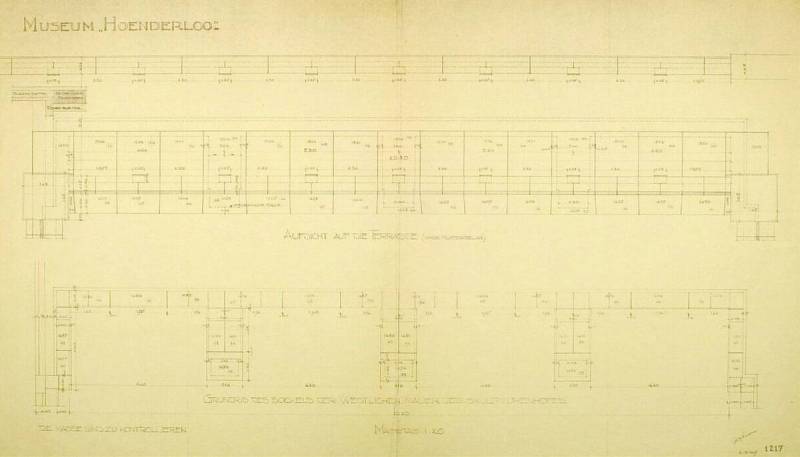 Ontwerp voor het museum bij de Franse Berg: Zicht op het terras (zonder bestrating) / grondplan van de basis van de westelijke muur van het 'Skulpturenhof', 4 augustus 1927
