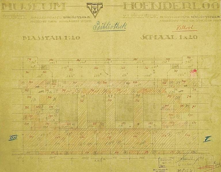 Ontwerp voor het museum bij de Franse Berg: Zuidzijde, buitenmuur bibliotheek, aanzicht van de schuine hoek, 8 december 1921
