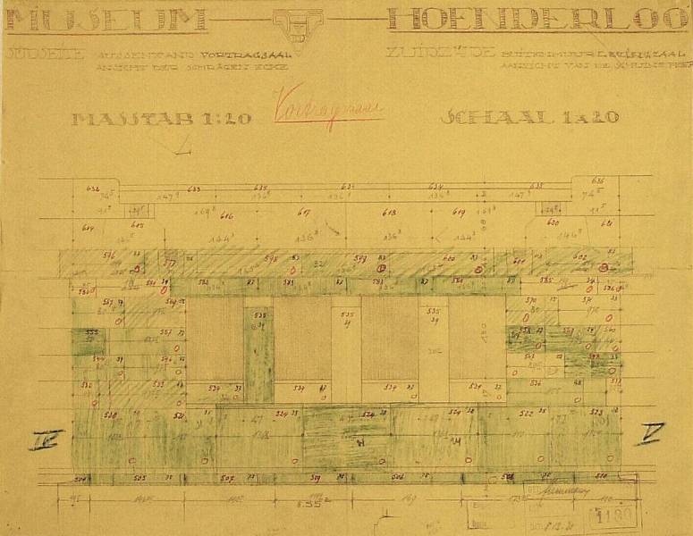 Ontwerp voor het museum bij de Franse Berg: Zuidzijde, buitenmuur lezingzaal, aanzicht van de schuine hoek, 8 december 1921
