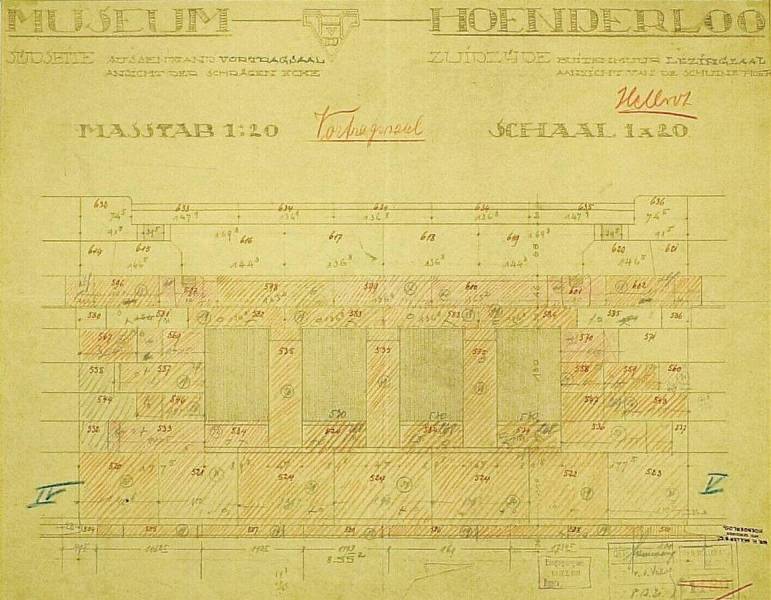 Ontwerp voor het museum bij de Franse Berg: Zuidzijde, buitenmuur lezingzaal, aanzicht van de schuine hoek, 8 december 1921