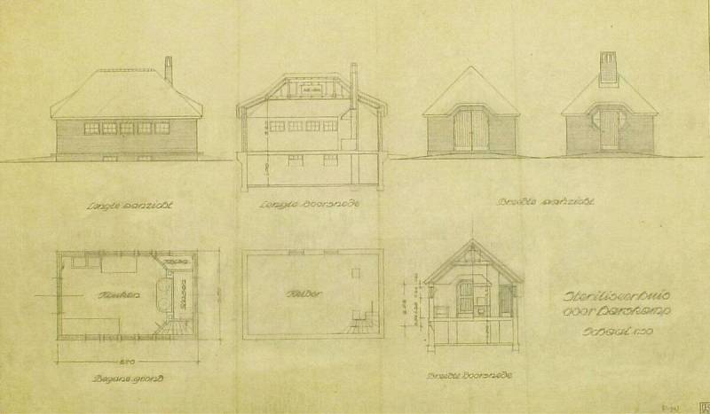 Steriliseerhuis, boerderij De Harscamp, twee plattegronden, twee doorsnedes en drie aanzichten, 4 maart 1921