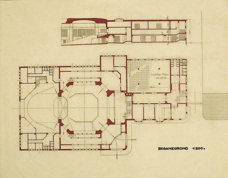 Volksuniversiteitsgebouw Den Haag, plattegrond van de begane grond en (gedeeltelijke) doorsnede, circa 1923
