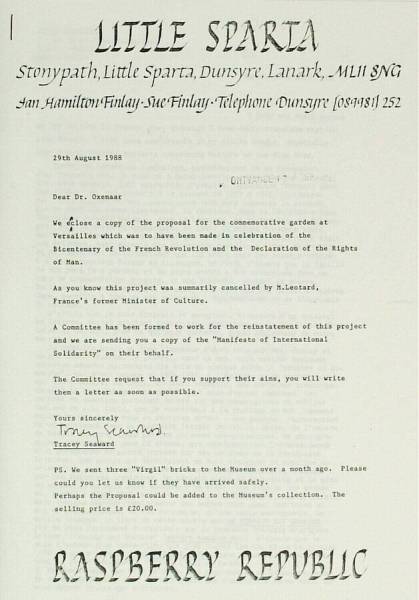 Brief van Tracey Seaward aan R. Oxenaar; brief van Serge Grunberg aan Ian Hamilton Finlay en een 'Manifeste de solidarité internationale à Ian et Sue Hamilton Finlay', 29 augustus 1988