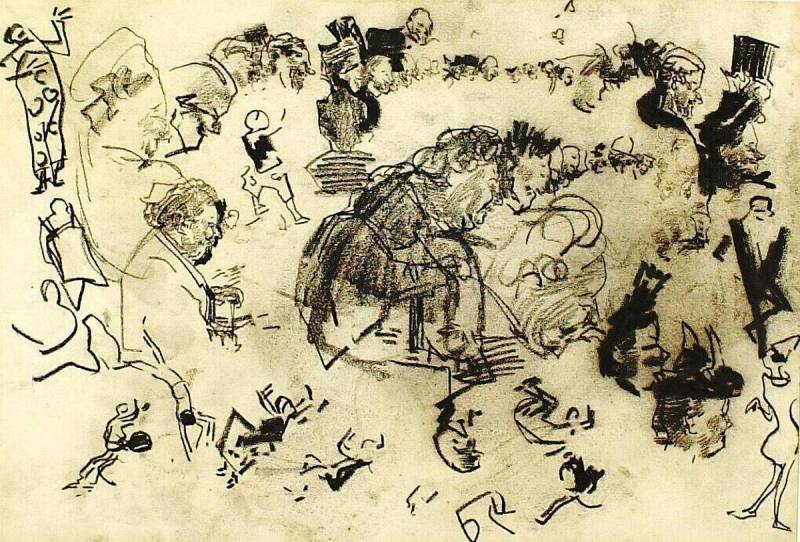 Studieblad met circusartiesten en circuspubliek, eind 19de - begin 20ste eeuw
