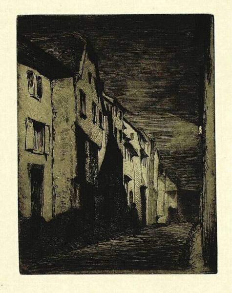 Straatje met oude huizen bij avond, tweede helft 19de - begin 20ste eeuw